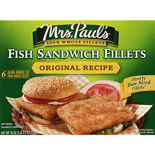 6 golden, breaded, cut from whole fillets. 100% whole fillets. Heart bun sized fillets! Bread not included. 100% Recyclable: Recycling programs for this package may not exist in your area. Each Mrs. Paul's product guarantees fresh taste every time. Questions or comments? 1-800-798-3318. www.mrspauls.com.